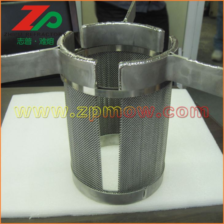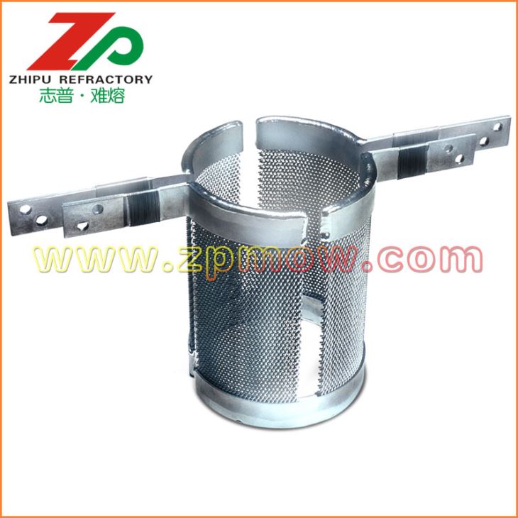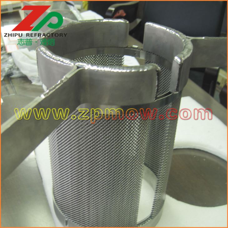 發(fā)熱體一般采用鳥籠結(jié)構(gòu)鎢發(fā)熱體或者鎢絲網(wǎng)發(fā)熱體,有利于提供均勻穩(wěn)定的溫場(chǎng)。 鎢絲網(wǎng)發(fā)熱體組件做為藍(lán)寶石晶體生長(zhǎng)爐內(nèi)的熱源,對(duì)鎢坩堝內(nèi)的熔液形成湍流、產(chǎn)生徑向溫度梯度具有決定性的作用。因此,具有高純度、高密度、制作精良、設(shè)計(jì)合理的鎢絲網(wǎng)發(fā)熱體組件對(duì)藍(lán)寶石晶體的質(zhì)量控制,節(jié)約能源以及使用壽命具有重要意義。
